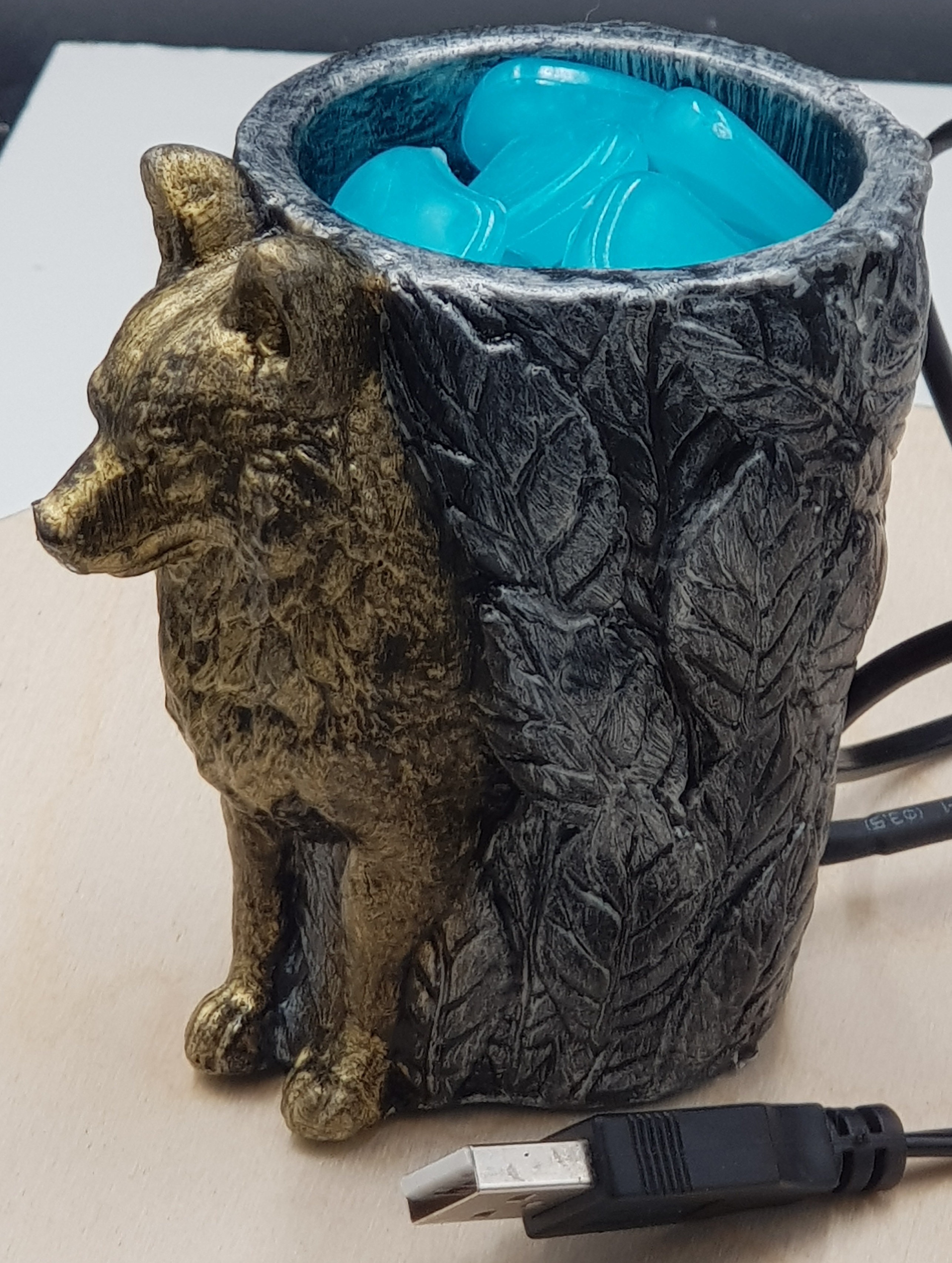 Nachtlicht Wolf mit Behälter, Led Licht Kunststeine blau fluoreszierend
